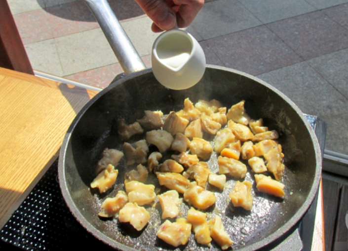 На сковороду вливаем оливковое масло и обжариваем мясо рапанов 2–3 мин.