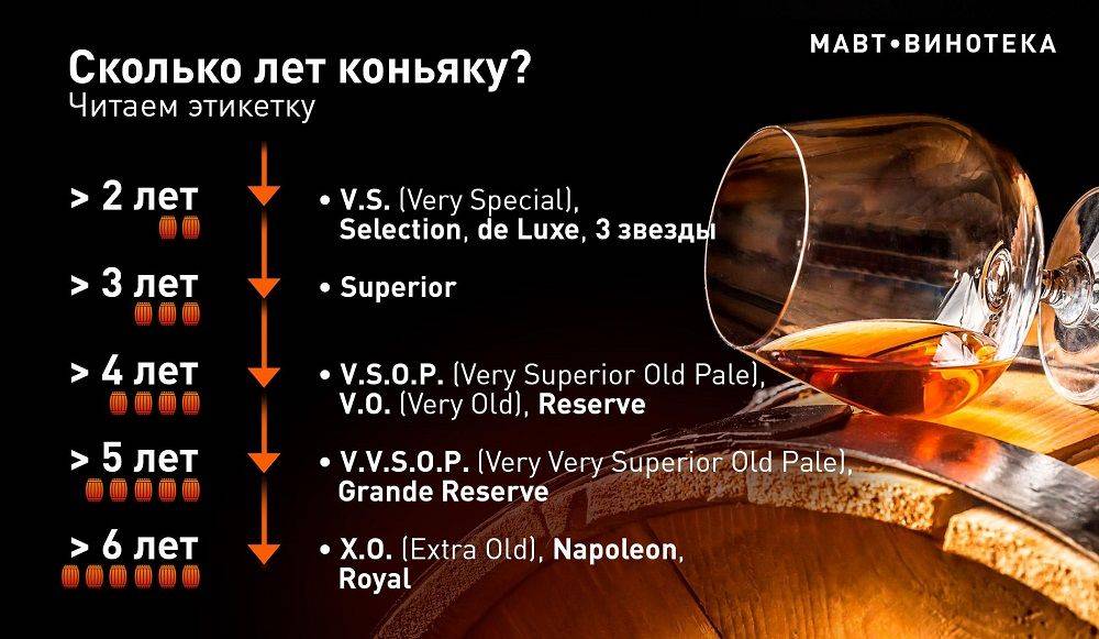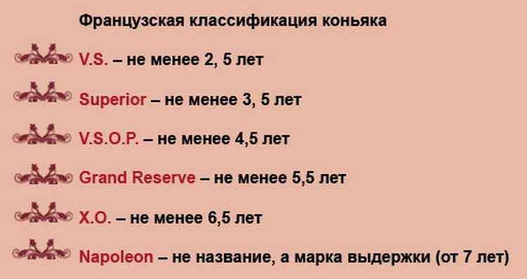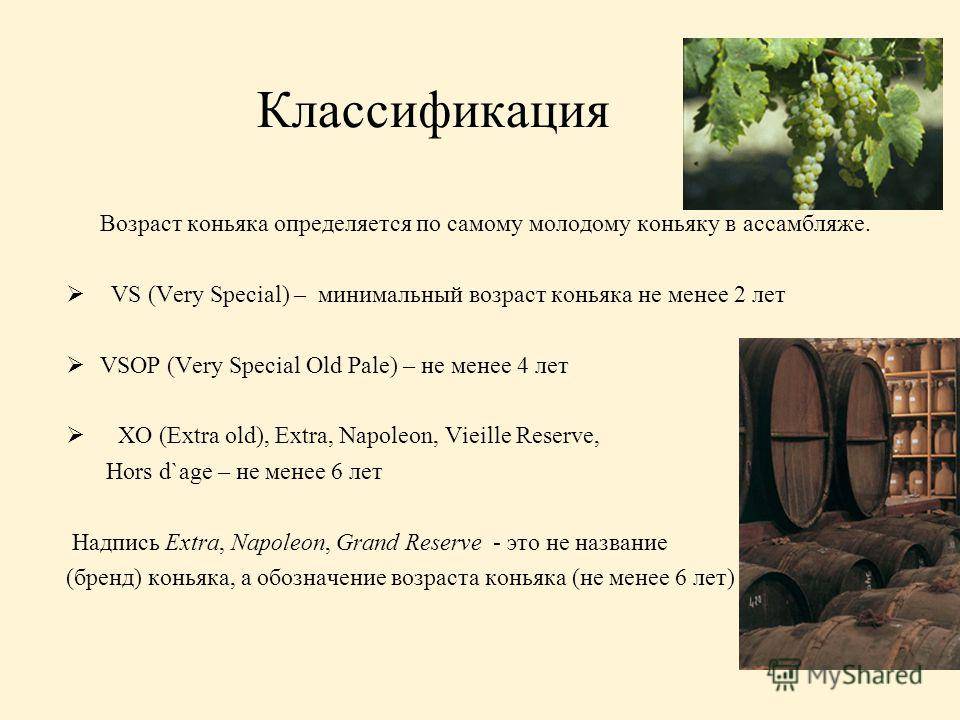 Классификация коньяков зависит от возраста напитка и сырья, из которого он изготовлен. Самый важный показатель — крепость алкоголя и технология его приготовления. Хотя принцип создания этого напитка один, но определенные отличия и свои секреты все же имеет каждый бренд.