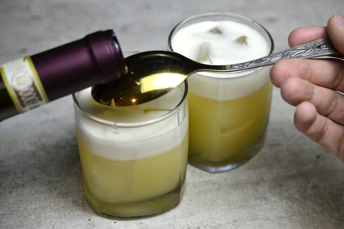 Теперь займемся «Нью-Йорк Сауэром», добавим по ложке вино в один из стаканов.
