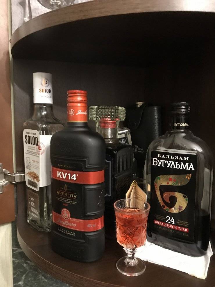 KV cooler состоит из бехеровки, белого вина и содовой. В стакане стиля old fashioned нужно смешать 45 мл настойки, 60 мл белого вина и содовой. Вино стоит выбирать так, чтобы оно было чуть более сладким, чем травяная настойка. Декорируют бокал виноградинами разного цвета.
