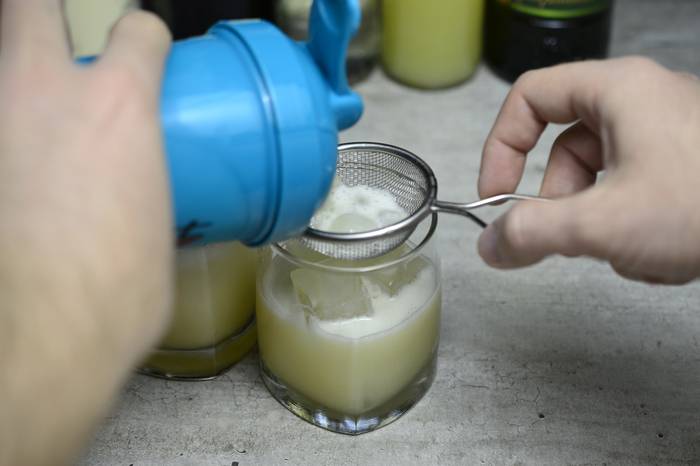 - Взбалтываем ингредиенты до полного растворения льда и возникновения белой пенки.