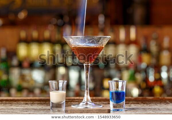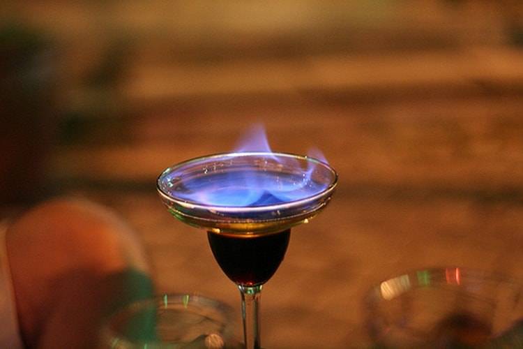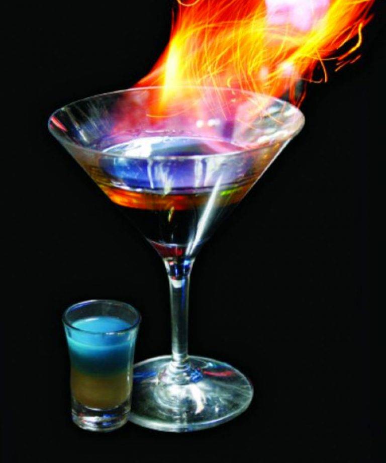 Этот коктейль пьётся через тоненькую трубочку. «Пылающий Ламбаржини» очень похож на ракетное топливо, а внешним видом на горящее пламя. Этот коктейль популярен среди молодёжи, которая посещает ночные клубы. Вам понадобиться: по 30 грамм абсента, «Bailey`s», кофейного ликёра и самбуки, а также корица. Залейте самбуку, кофейный ликёр и в специальный котельный бокал, затем в два совершено разных бокала налейте «Bailey` s» и «Блю кюрасао». Их необходимо поставить рядом. Подожгите главный коктейль и пейте через соломинку. В тот момент, когда коктейль заканчивается, долейте «Bailey` s» и «Блю кюрасао». Некоторые добавляют ещё мартини. Вы должны пить коктейль не останавливаясь, что бы ни произошло. Красиво выстраивают башню, только профессиональные бармены, которые умеют это делать правильно, потому что корица, которую добавляют в конце приготовления, вспыхивает и искрится. Вся композиция похожа на красивый бенгальский огонь.