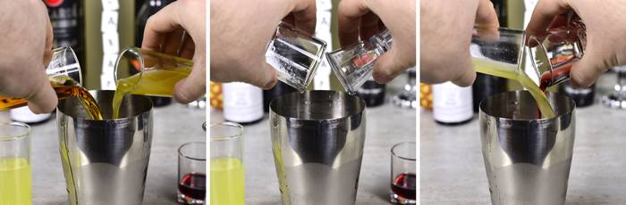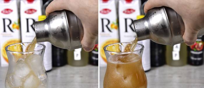 Трясем шейкер, после чего сливаем содержимое в бокал (предварительно вылив из него воду):