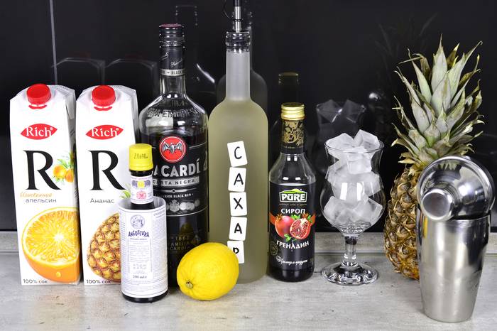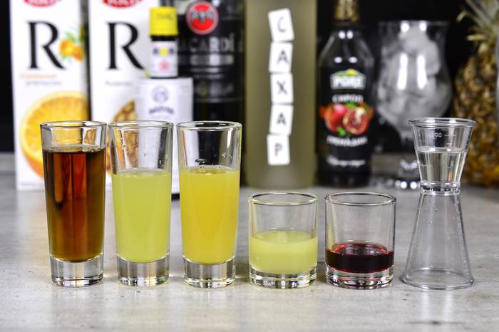 Пока шейкер охлаждается, отмерим 45 мл рома, 35 мл апельсинового сока, 35 ананасового сока, 20 мл лимонного сока, 10 мл гренадина, 10 мл сахарного сиропа: