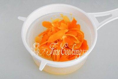 Откидываем содержимое банки на сито, после чего руками отжимаем мандарины и цедру.