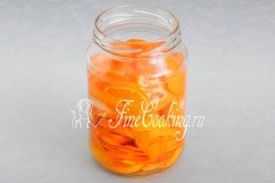 Берем чистую банку емкостью 800-1000 мл, перекладываем в нее цедру апельсина, лимонов и ломтики мандаринов.