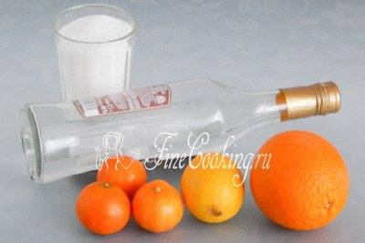 Для приготовления этого вкусного и ароматного домашнего ликера нам понадобятся следующие ингредиенты: водка, сахар, крупный апельсин, пару лимонов среднего размера и 6 мелких мандаринок (более крупных хватит 4-5 штук).
