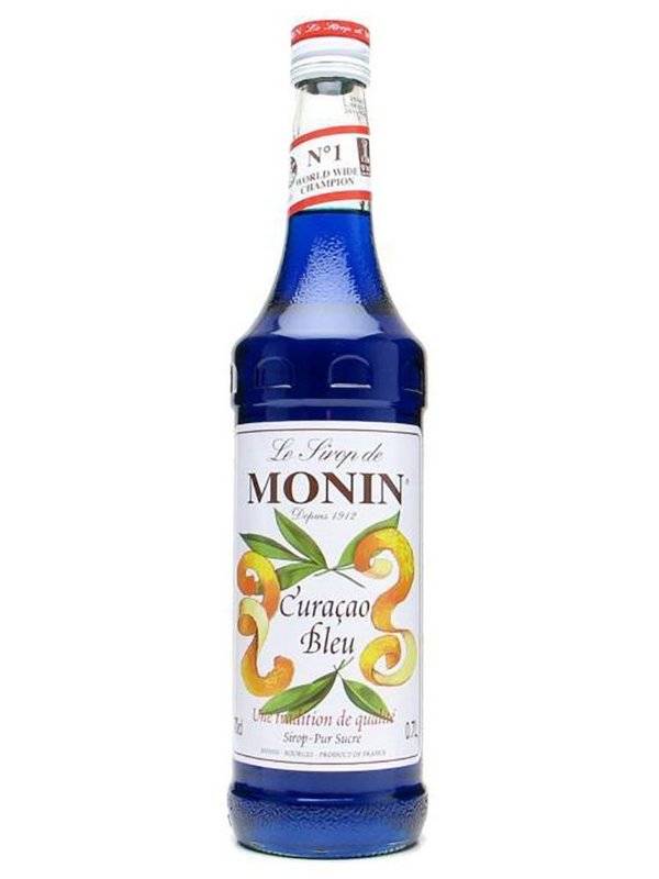 Monin, Liqueur de Blue Curacao, 20% – глубокий синий цвет напитка, дополняет вкус и аромат цитрусовых фруктов с приятным горьким послевкусием.