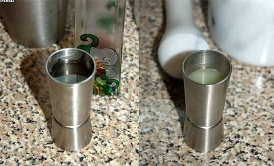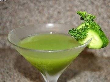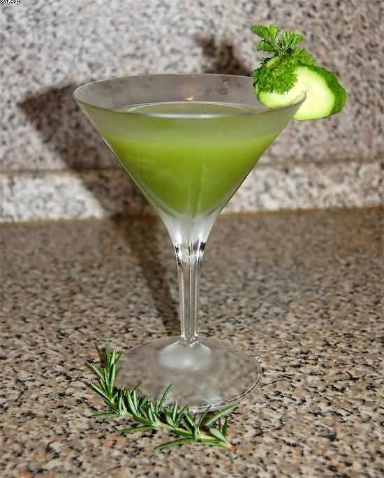 Вынимаем коктейльный бокал, который в тепле мгновенно обмерзает (!). Быстро и аккуратно сливаем в него содержимое шейкера, процеживая от кусочков льда и ошметков зелени.