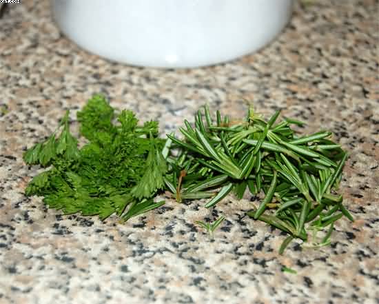 Моем розмарин и обрываем его листья-иголочки. С петрушкой поступает также – стебельки нам не нужны.