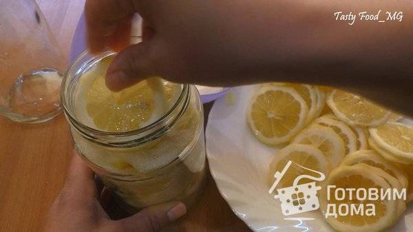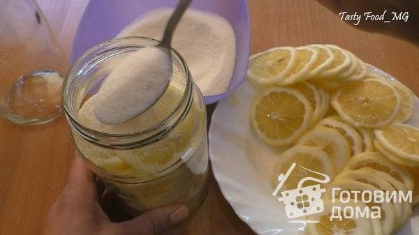Далее в чистую и сухую банку насыпать чуточку сахара, затем выкладывать кружочки лимона, затем снова посыпать лимончики сахаром, и так до тех пор, пока банка не заполнится.