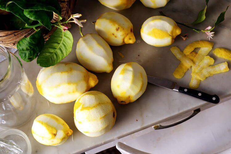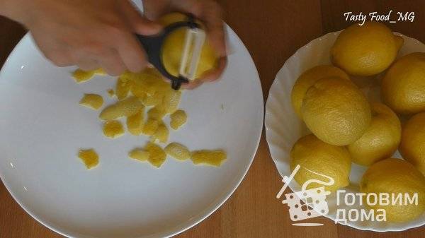Для начала нужно тщательно вымыть и обсушить лимоны. Затем, используя нож для чистки овощей (обычный нож здесь не подойдет), аккуратно снять с плодов цедру — верхнюю желтую часть кожуры