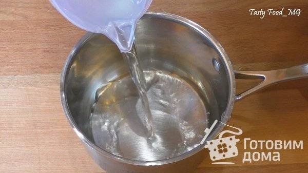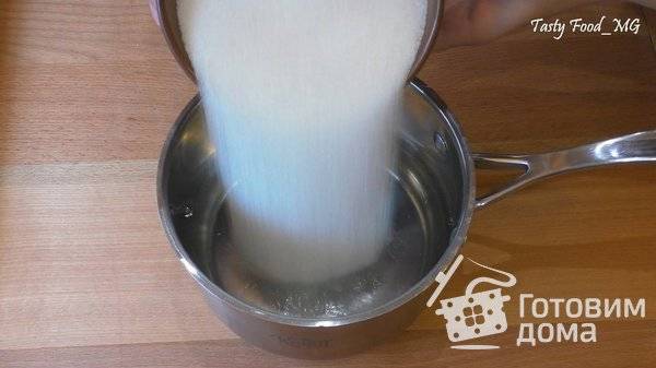 8. В маленькой кастрюльке из 100 мл воды и 300 г сахара сварить . Сахар добавлять в воду небольшими порциями. Каждая следующая порция должна попасть в кастрюльку после полного растворения предыдущей. Если в процессе появится пена, нужно обязательно ее снимать.