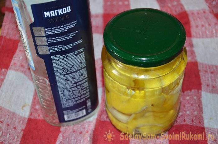 3. Перекладывают цедру в банку и заливают водкой. Банку нужно поставить в темное место и выдержать при комнатной температуре трое суток. Вместо водки, можно использовать домашний самогон хорошего качества.