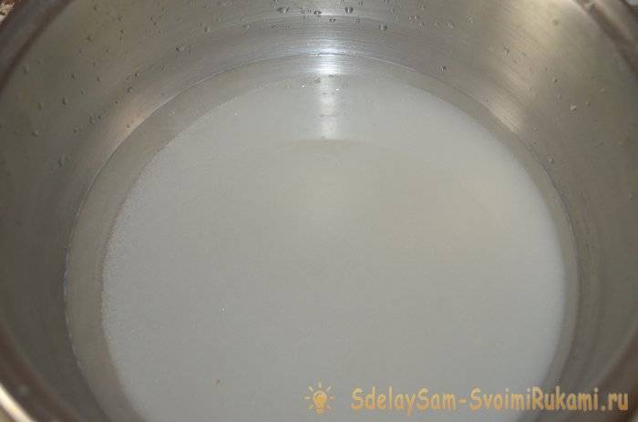 4. В кастрюлю налить воду и всыпать сахар, сироп нужно лишь подогреть, но не кипятить.