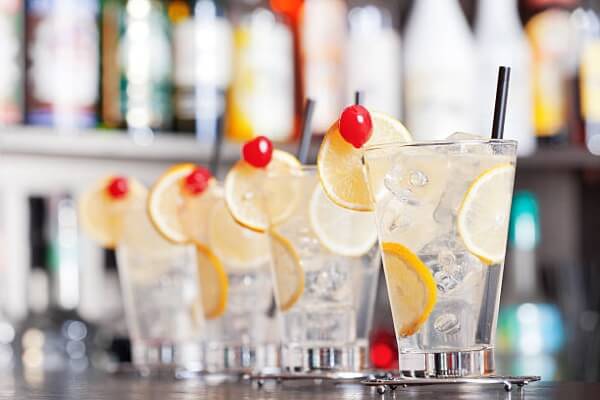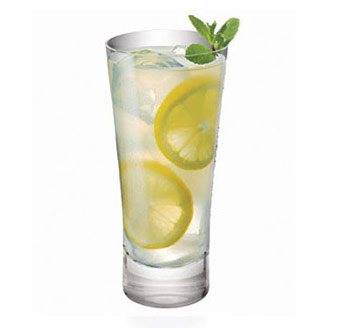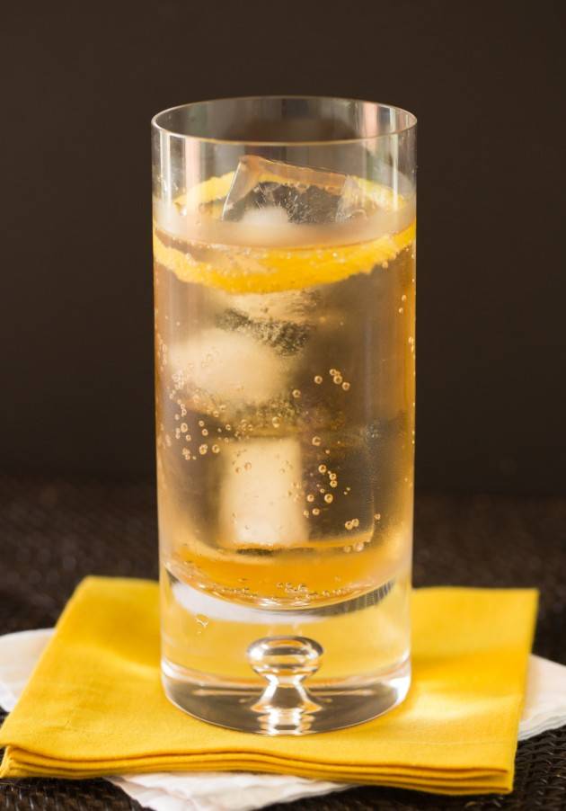 - В наполненный льдом шейкер помещают алкоголь, сок лимона и сахарный сироп. Перемешанную массу процеживают в стакан, на 2/3 заполненный кубиками льда. Сверху выливают минеральную (или содовую) воду. Украшают кусочком лимона или вишней.