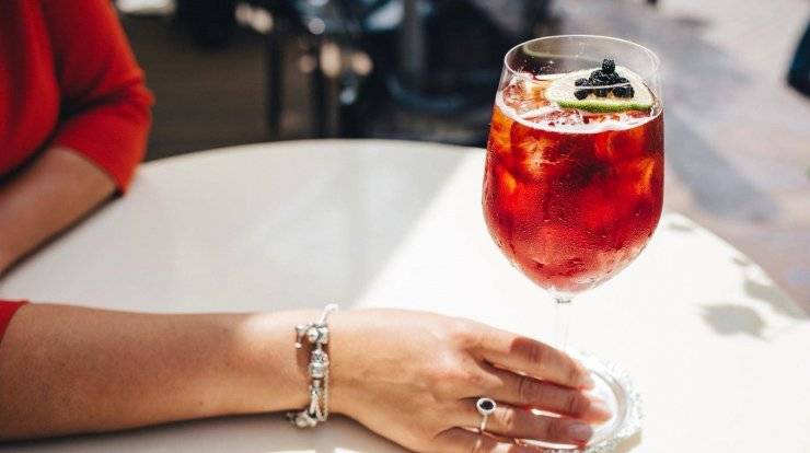Наполни винный бокал льдом , добавь вермут , джин , шраб из томатов и кордиал — перемешай и долей Проссеко.