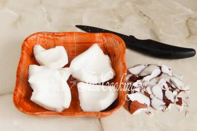 Острым ножом или с помощью овощечистки снимаем тонкий коричневый слой, который находится сверху кокосовой мякоти. Кстати, эти очистки тоже съедобные и по вкусу мало чем отличаются от белоснежной мякоти — у меня они моментом улетает благодаря домашним.