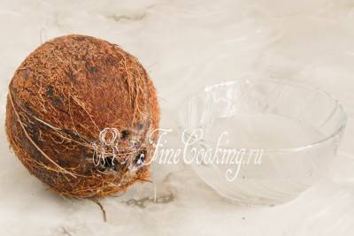 Выливаем через глазок прозрачную кокосовую водичку в отдельную посуду. В этом рецепте она нам не нужна — можете просто выпить (по вкусу она сладковатая). У меня в крупном кокосе было ровно 70 миллилитров кокосовой воды.