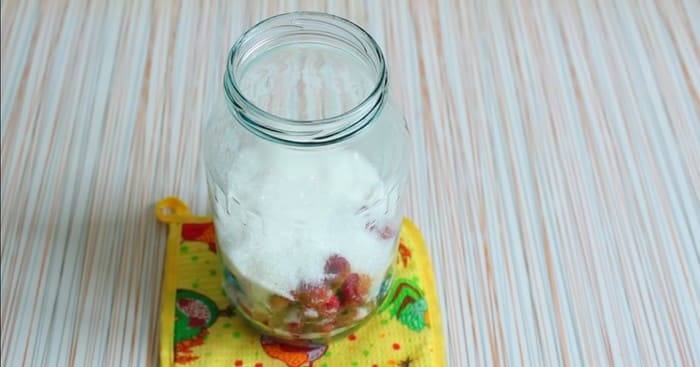 Сразу в банку всыпаем сахар. Уменьшать его количество не рекомендуется. Ведь он является природным консервантом и препятствует размножению бактерий в заготовках. Поэтому вероятность того, что компот забродит или «взорвется» минимальная.