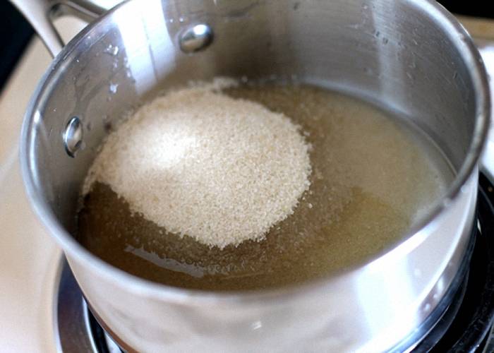 - Высыпьте в кастрюльку сахар (желательно рафинад) и залейте водой.