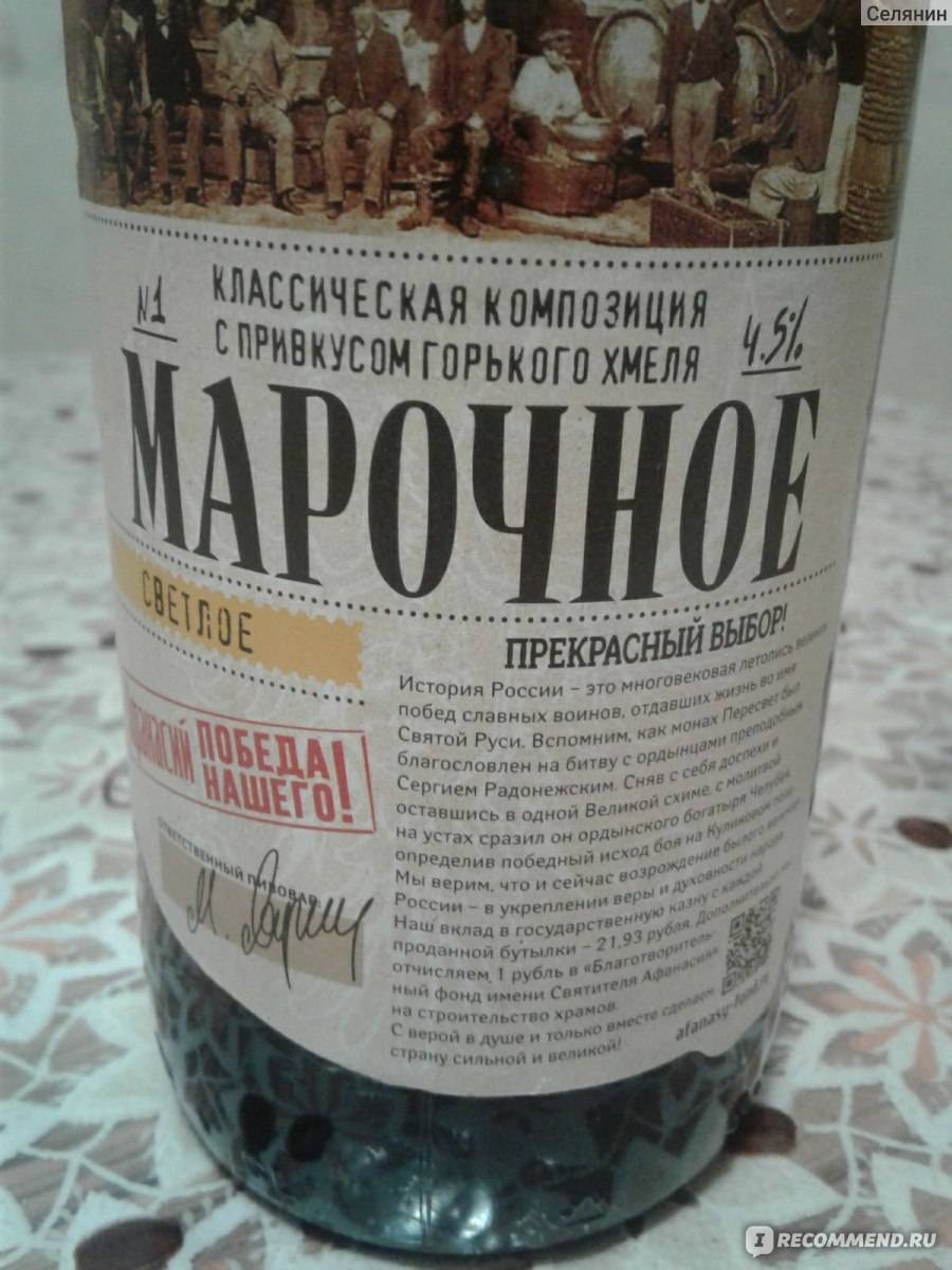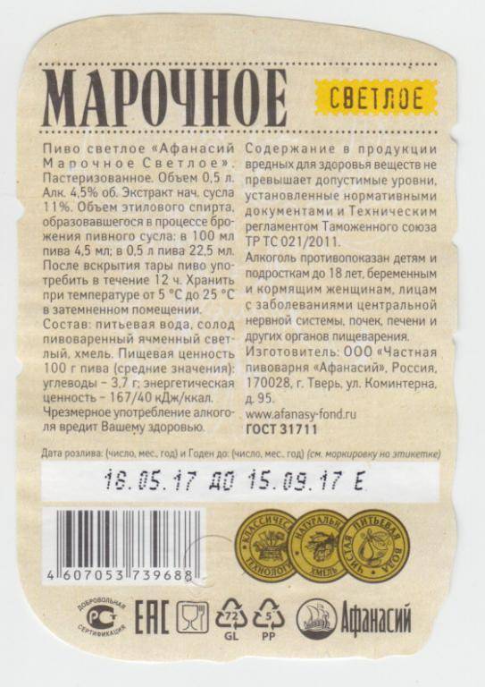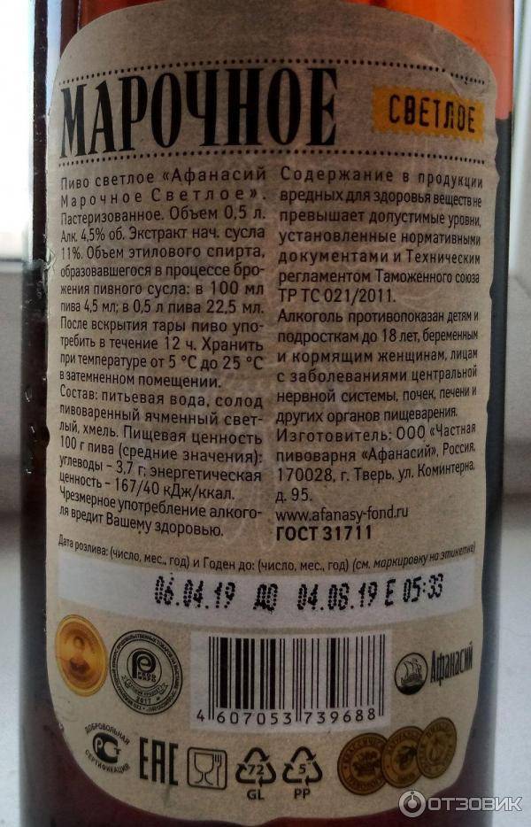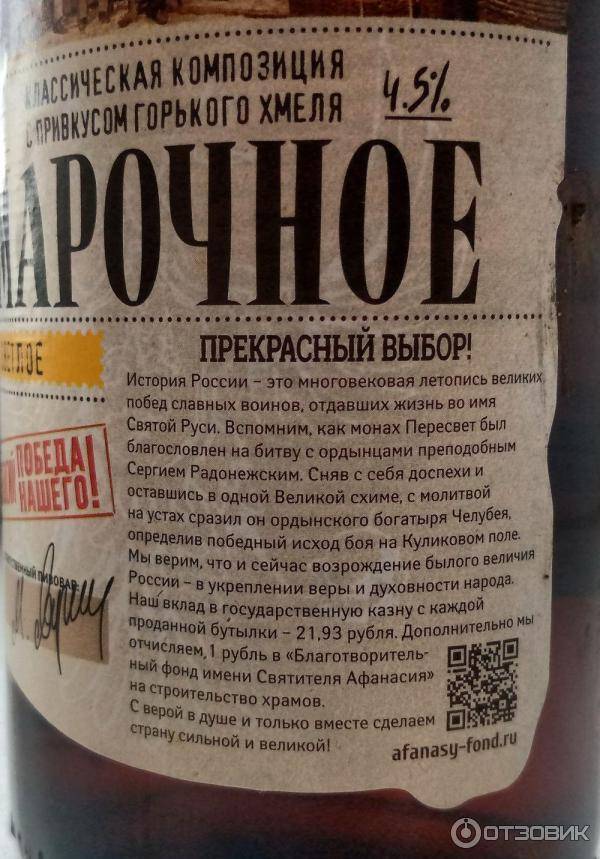 Пиво Афанасий Марочное. Хмельное желто-золотистого цвета с мощным солодово-хмельным букетом ароматов и легкой горечью в послевкусии. Основой вкуса выступает яркая хлебная доля.