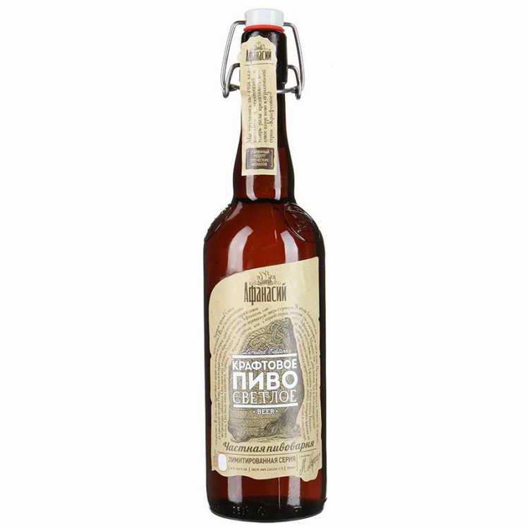 Пиво Афанасий Нефильтрованное. Алкоголь, который создается исключительно на современном немецком оборудовании. Радует золотисто-желтым окрасом и стойким ароматом, в основе которого лежит дрожжевая свежесть и цветочные полутона. Вкусовые амбиции выражены нежнейшим привкусом сухофруктов с горчинкой.