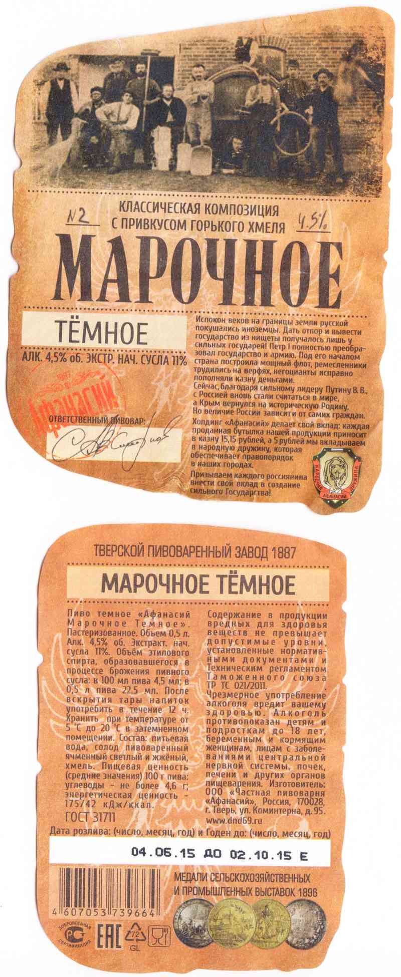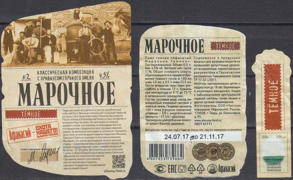 Один из первых пивных брендов России “Афанасий” – бренд тверского пивзавода ОАО “Афанасий-пиво” – существует на рынке более 10 лет.