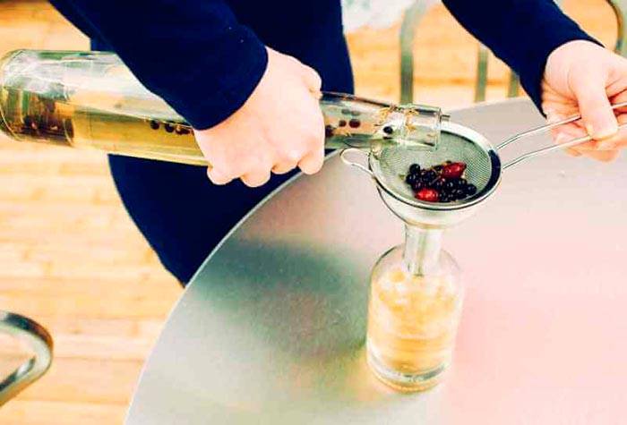 Ягодки нужно раздавить в ступке или скалкой, залить водкой и отправить настаиваться 2 недели в темном месте. После этого – процедить. Теперь настойку можжевельника на водке можно употреблять. Единственный нюанс – напиток может получиться жестковатым, особенно если вы использовали не водку, а спирт или самогон. В таком случае в него нужно добавить немного сахарного сиропа или фруктозы – по желанию. После этого можжевеловку нужно отстоять еще 2-3 дня.
