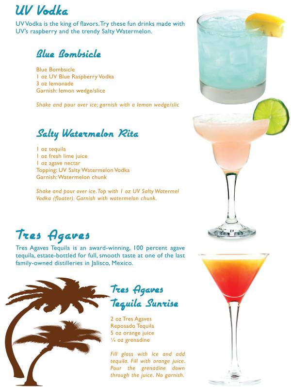 В широкие бокалы налей коктейль, укрась свежими фруктами на шпажке и подавай.