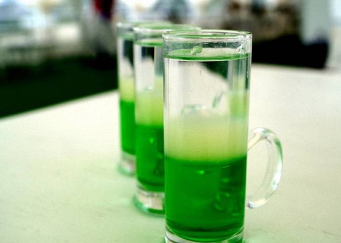 Hiroshima (Хиросима). Налить в рюмку слоями по 20 мл самбуки, Бейлиса и абсента, затем добавить несколько капель гренадина – на дне стопки как будто распустится атомный гриб.