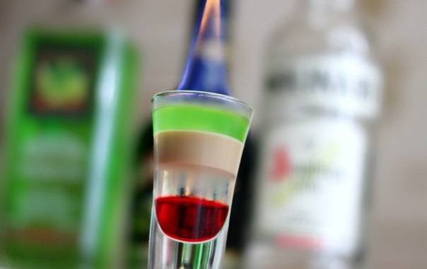 Russian Flag (Флаг России). Традиционный триколор: уложить слоями по 20 мл гренадина, ликера Блю Кюрасао и водки. Чтобы верхний слой получился белым, а не прозрачным, можно заранее добавить в воду немного сливок. Выпить залпом, испытывая патриотическую гордость.