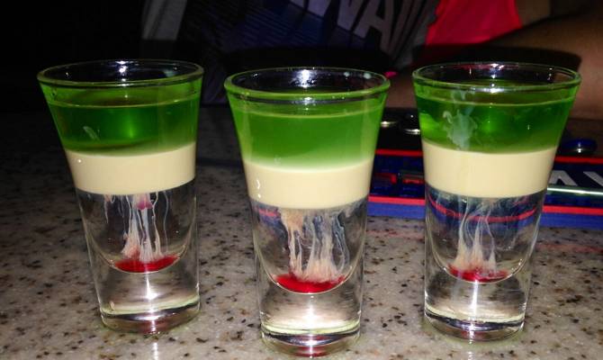 Jellyfish (Медуза). Уложить слоями по 20 мл светлого шоколадного ликера (Crème de cacao) и Амаретто, аккуратно добавить столько же или чуть меньше сливочного ликера. Капнуть несколько капель гренадина и смотреть, как медуза перебирает щупальцами!
