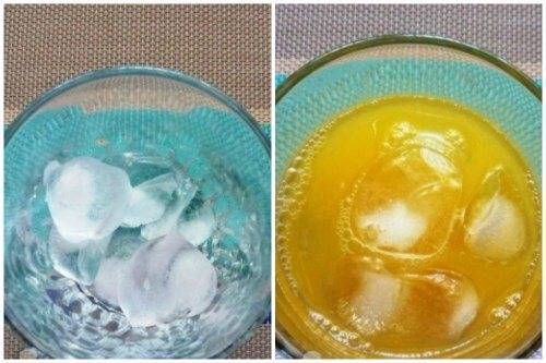 3. Слегка размешиваем получившуюся жидкость и опускаем в нее кубики льда.