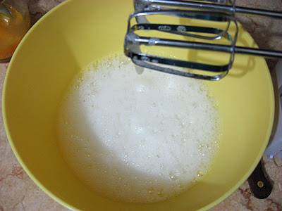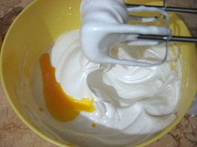 Пора добавлять желтки, так же медленно, по 1 ст. ложке, продолжая взбивать.