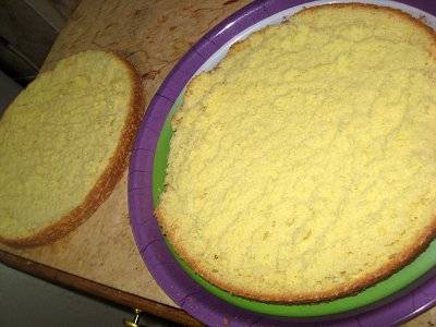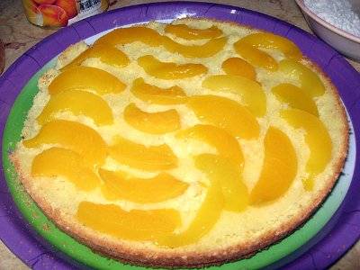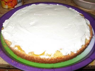 Коржи пропитать сиропом из под консервированных персиков. Сверху выложить персики (не плотно).