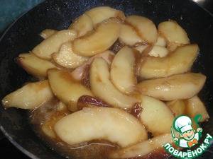 В сковороду насыпать 2 ст. л. сахара, влить 1 ст. л. воды, довести до кипения. Добавить нарезанные персики и варить (компотировать) около 3-4 минут до мягкости.