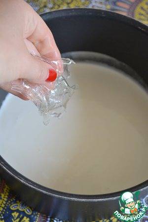 Листовой желатин замочить в большом кол-ве холодной воды на 10 мин.
