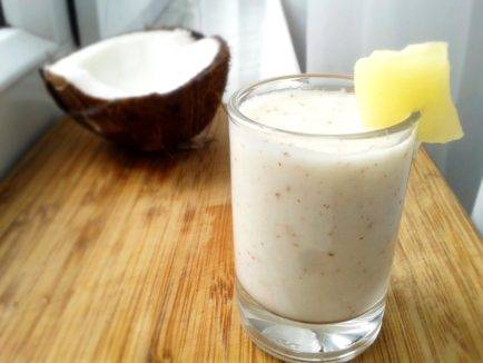 Способ приготовления не отличается: все ингредиенты смешайте в блендере с добавлением льда, перелейте в большой стакан, добавьте несколько капель сока лайма, украсьте ломтиком ананаса и вишней.