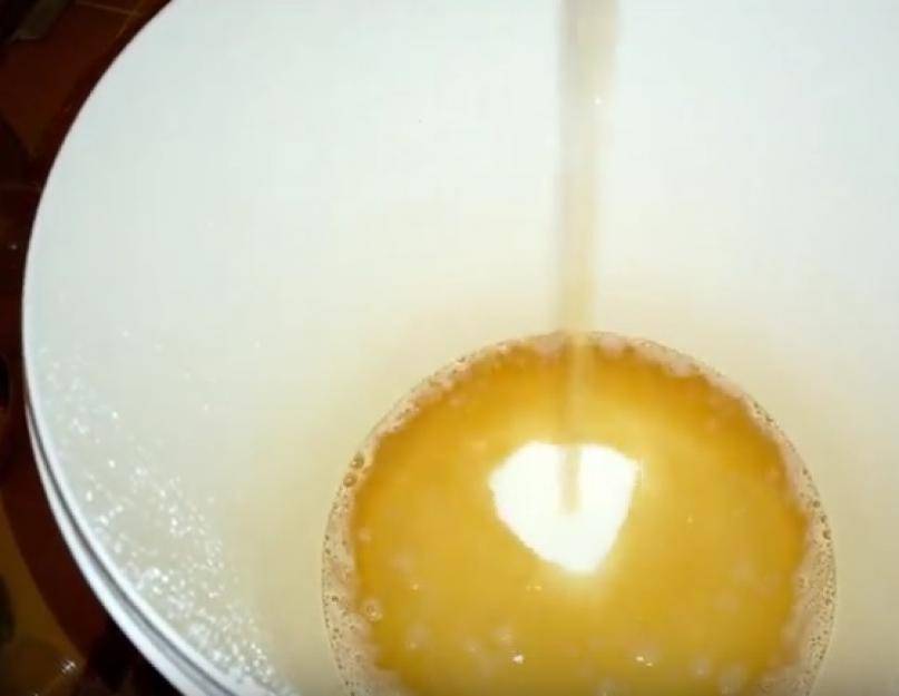 Пшеничное пиво по традиции должно быть нефильтрованным и мутноватым, поэтому мы ограничимся сливом через сито, чтобы просто отсечь крупные хлопья бруха.