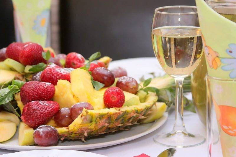 Фрукты: экзотические ананас, банан или персики, отечественные яблоки, виноград и груши, охлажденные шарики дыни. А вот от сочетания «шампанское и цитрусовые» лучше отказаться.
