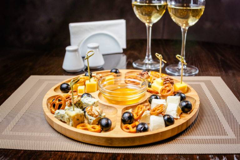Легкий нежный напиток должен сопровождаться низкокалорийными блюдами. Наиболее распространенные варианты закусок под шампанское брют или сухое:
