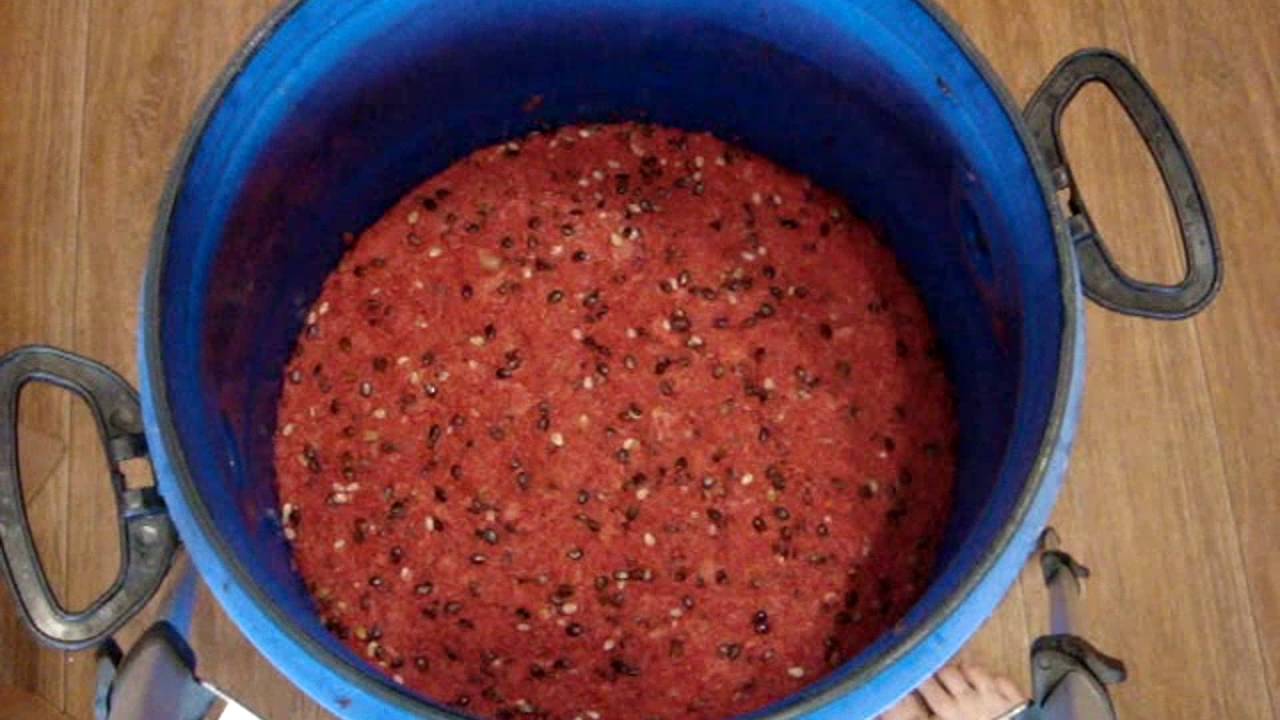 Чтобы извлечь мякоть из ягоды, используется ложка. Кожура и семечки не применяются для приготовления браги, так как содержат вредные компоненты и негативно отражаются на вкусе и запахе готового напитка. Семечки легко отделяются при перетирании мякоти сквозь сито с мелкими ячейками.