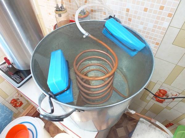 - Сверху в тазик, закрывающий кастрюлю наливается ледяная вода, которую нужно постоянно менять, не давая ей нагреваться