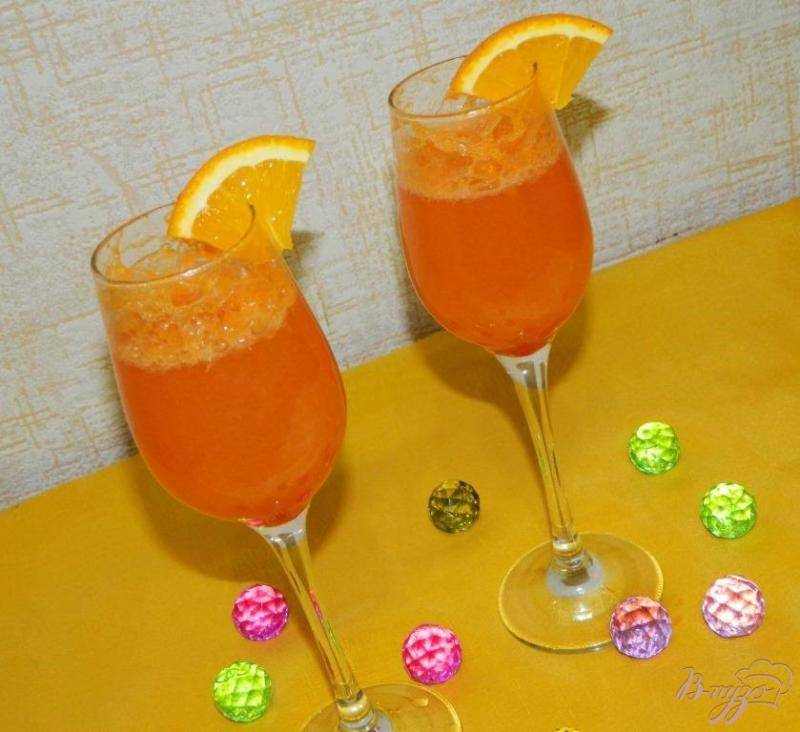 - Фруктовые смеси – это самые вкусные коктейли с шампанским, так как имеют выраженный вкус фрукта. Во время приготовления часто добавляют персик, апельсиновый сок, персик, банан и т. п.