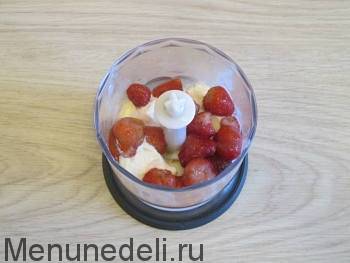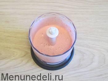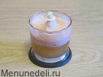 Подготовленные ингредиенты нужно измельчить при помощи блендера, взбивая на максимальных оборотах или на режиме «турбо». Делайте это, пока масса не станет однородной и пышной.