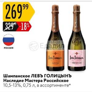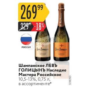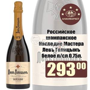 В 1900 году шампанское известного князя Льва Голицына завоевало Гран При на Всемирной Промышленной выставке в Париже, что положило начало возрождению производства игристого вина в России. Игристое вино “Наследие мастера “Левъ Голицынъ” было названо в честь князя, чей рецепт шампанского был воспроизведен талантливыми учениками. Секрет производства заключается в выдержке длиной в месяц, в процессе которой вино приобретает особую свежесть и удивительное переплетение аромата с оттенками цветов винограда и пикантной горчинки во вкусе. Это шампанское превосходно подходит для торжественных случаев, создавая особую атмосферу. Известно, что именно это игристое вино было на празднике в честь коронации Николая II.