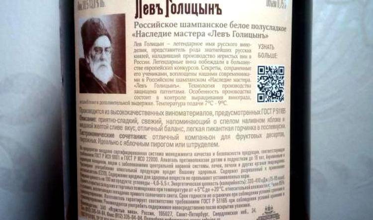 Шампанское «Лев Голицын» получило свое название в честь Льва Сергеевича Голицына. Этот человек жил в Российской империи, в конце XIX-начале XX вв. он занимался развитием виноделия в стране.