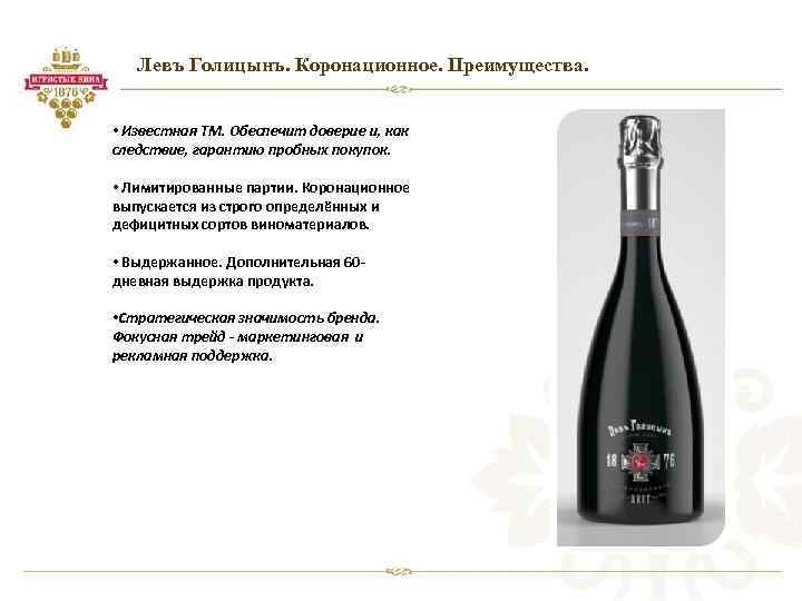 Князь Лев Голицын — это российский винодел. Он производил напитки в 19-20 веке и внес весомый вклад в развитие виноделия в стране. Игристое шампанское князя пришлось по вкусу французским ценителям, из-за чего напиток получил гран-при и всемирное одобрение. Именно на нем остановил свой выбор император Николай II. Поэтому продукт получил название Коронационное шампанское.