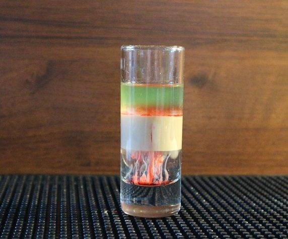 Рецепт: налить в рюмку самбуку, по ложечке или лезвию ножа добавить Бейлис так, чтобы слои не смешивались. Третьим слоем уложить абсент. Посредине рюмки добавить несколько капель гранатового сиропа. Выпить залпом или через соломинку, начиная с нижнего слоя. Можно предварительно поджечь.